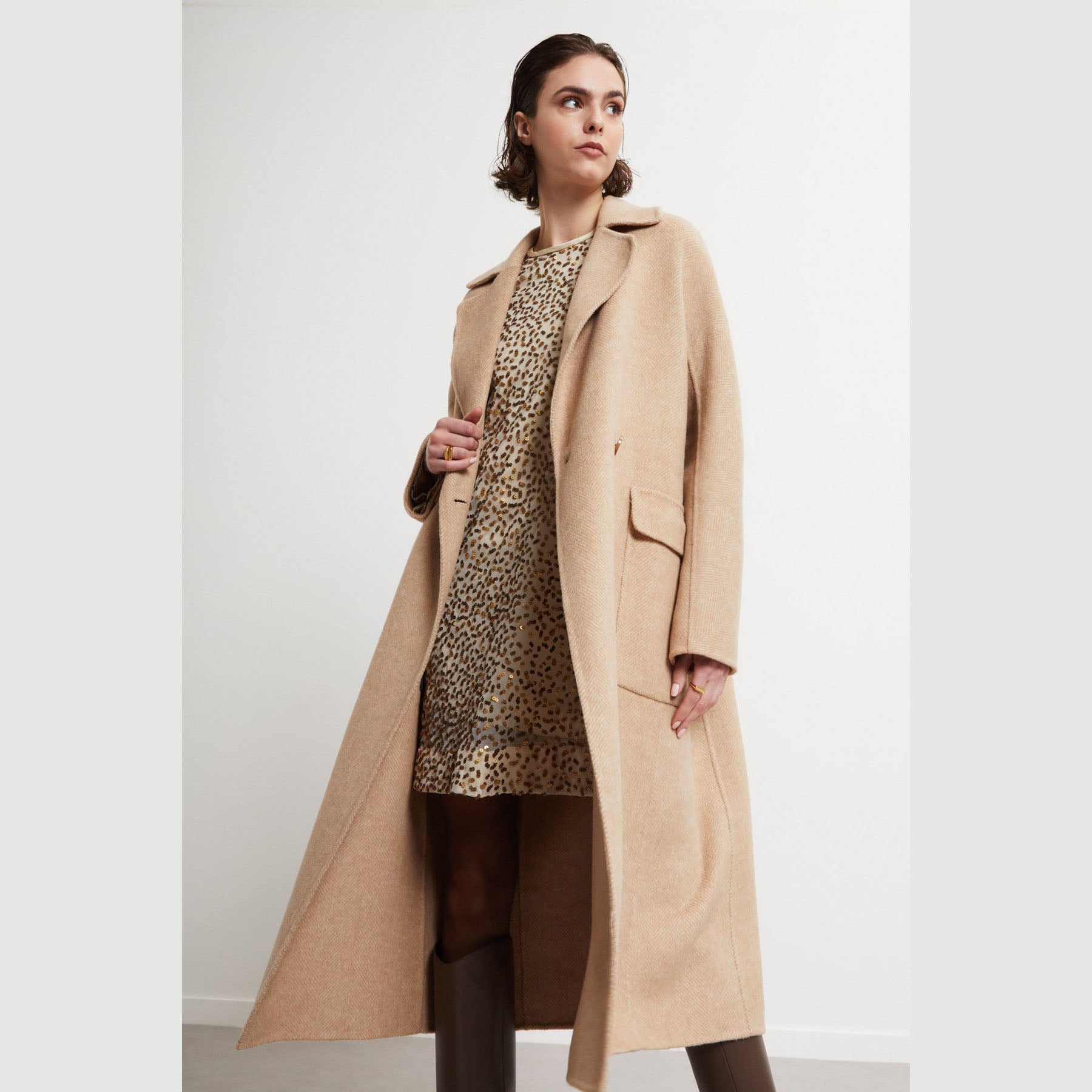 Cappotto lungo doppiopetto in misto lana spigata con cintura.