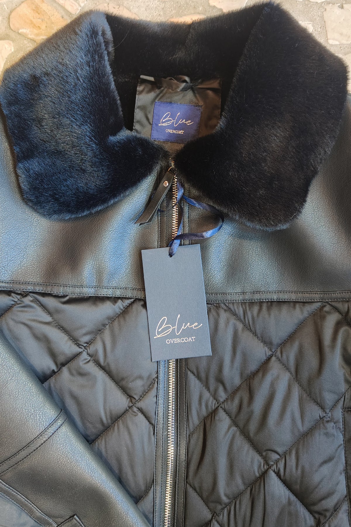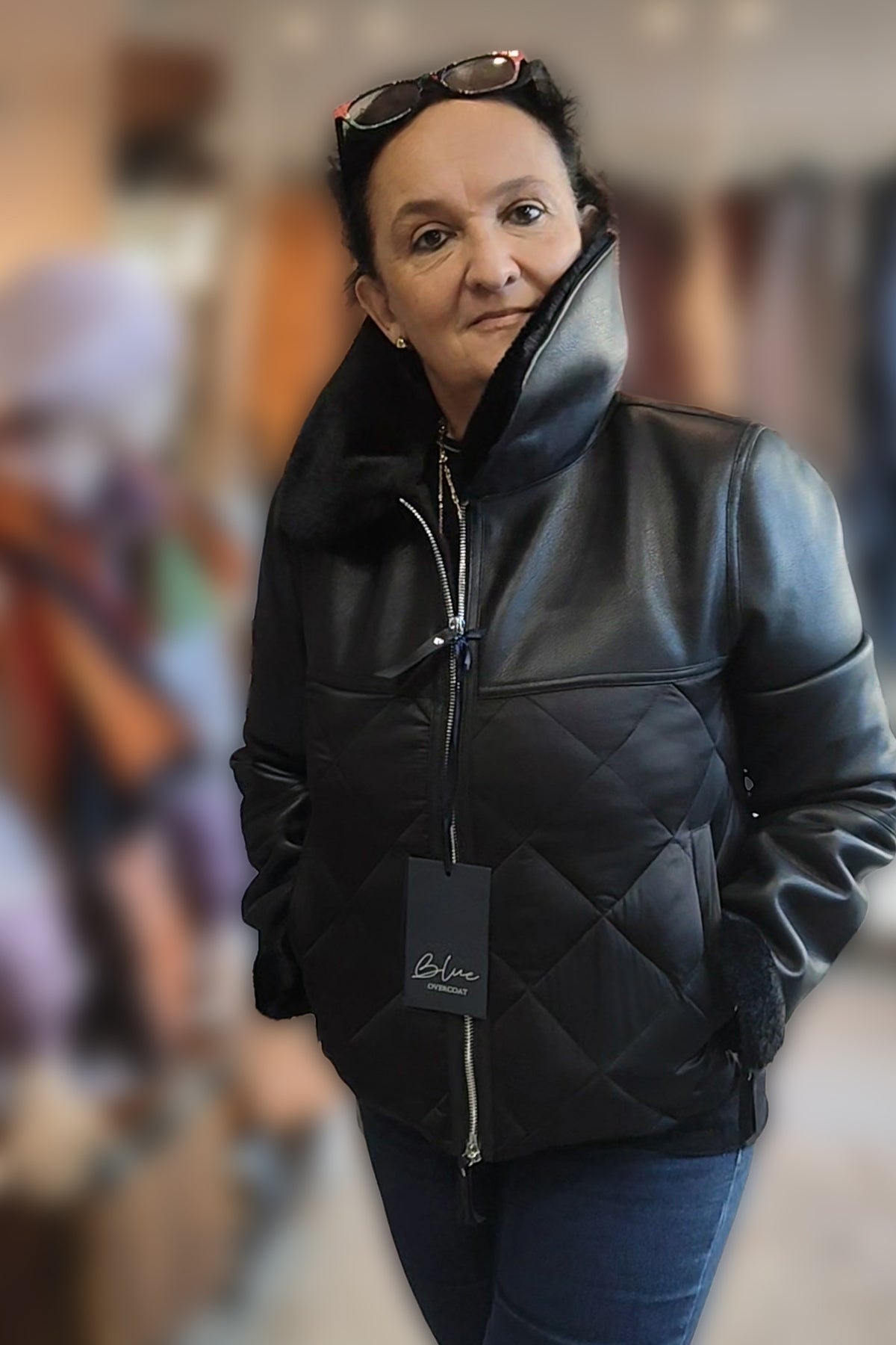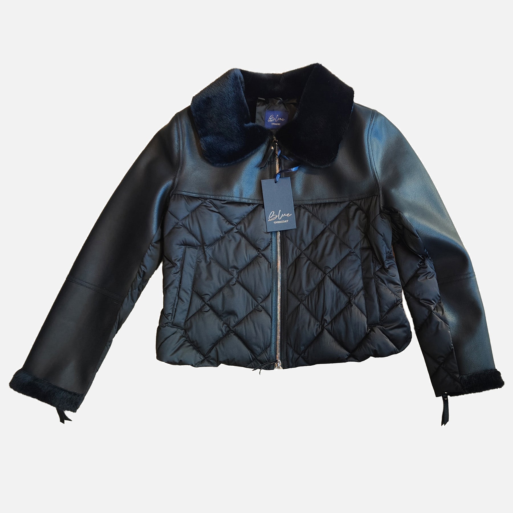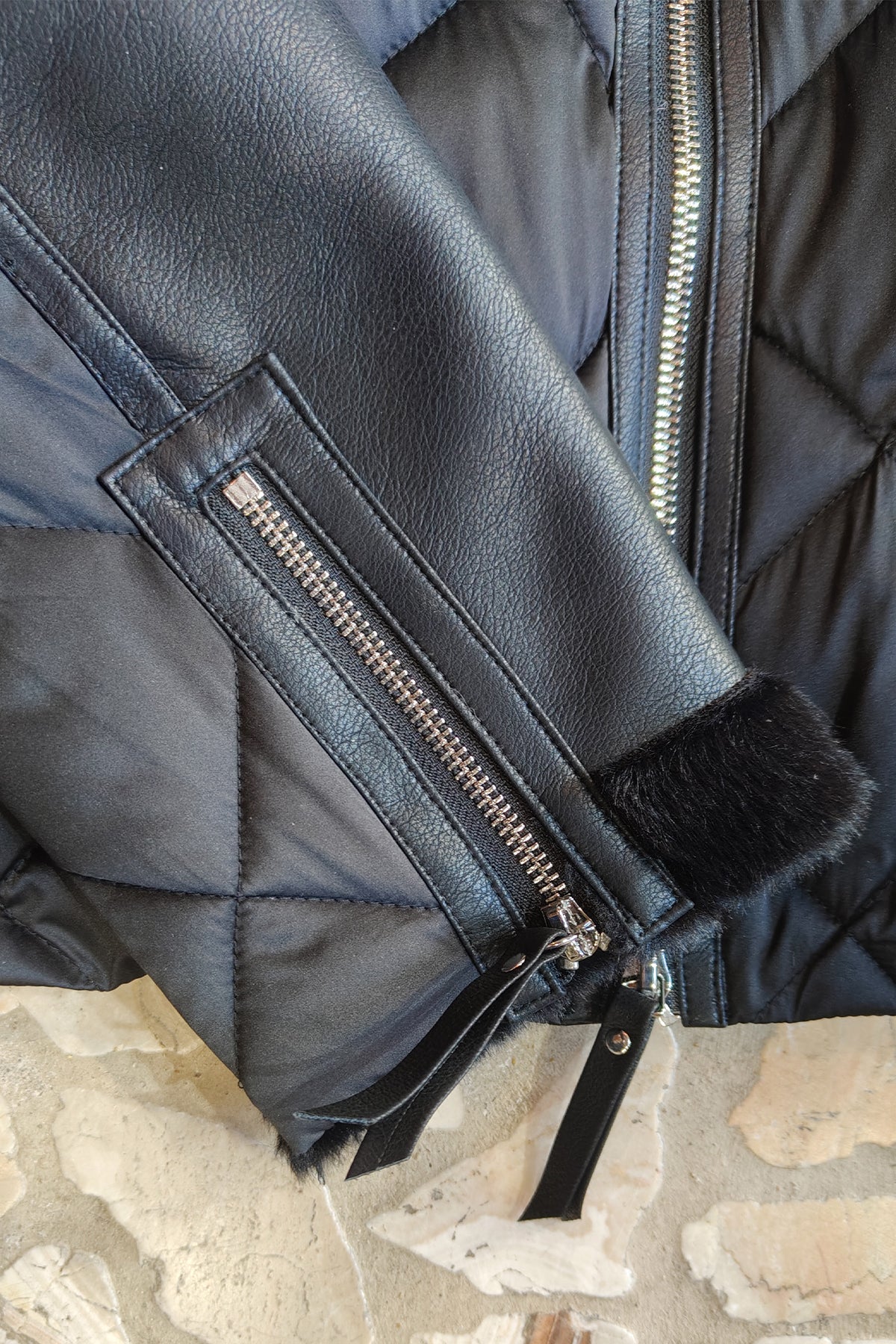 Giacca corta, piumino e eco pelliccia, chiusura e maniche con zip