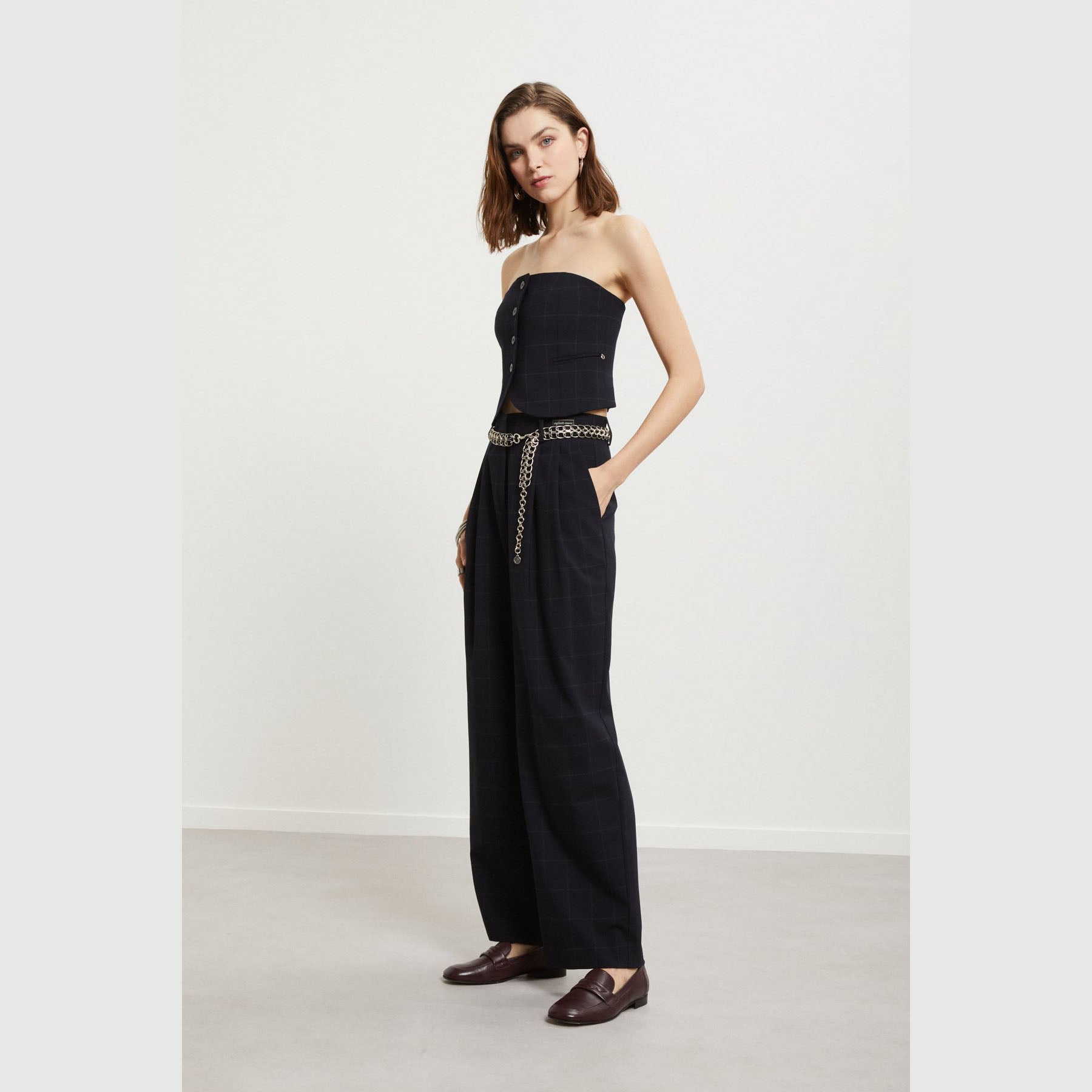 Pantalone balloon patchwork check in misto lana con pinces.