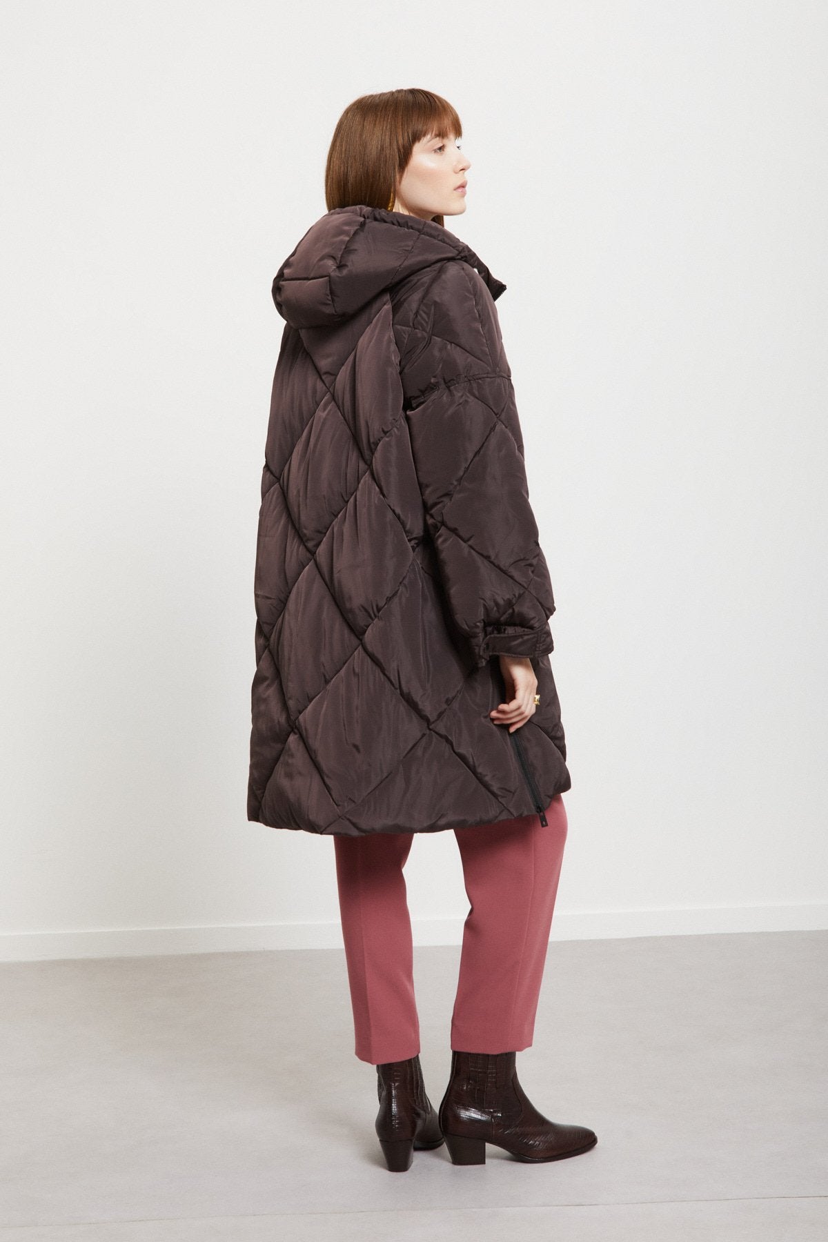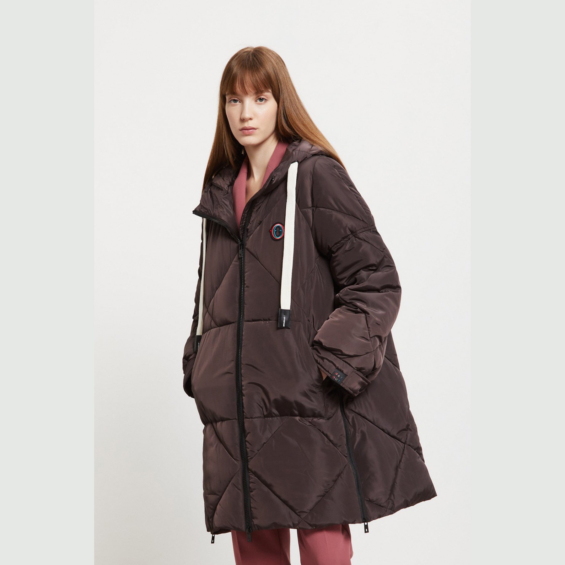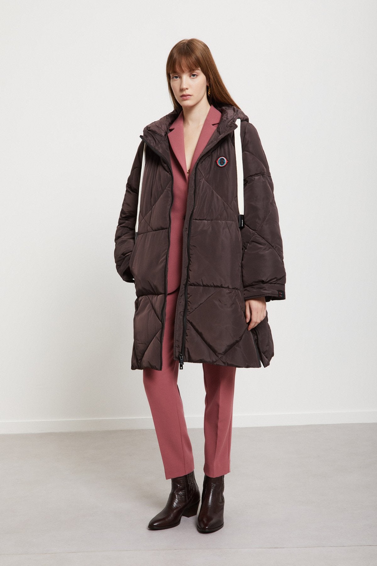 Piumino midi imbottito con impunture, zip e cappuccio con coulisse a contrasto.