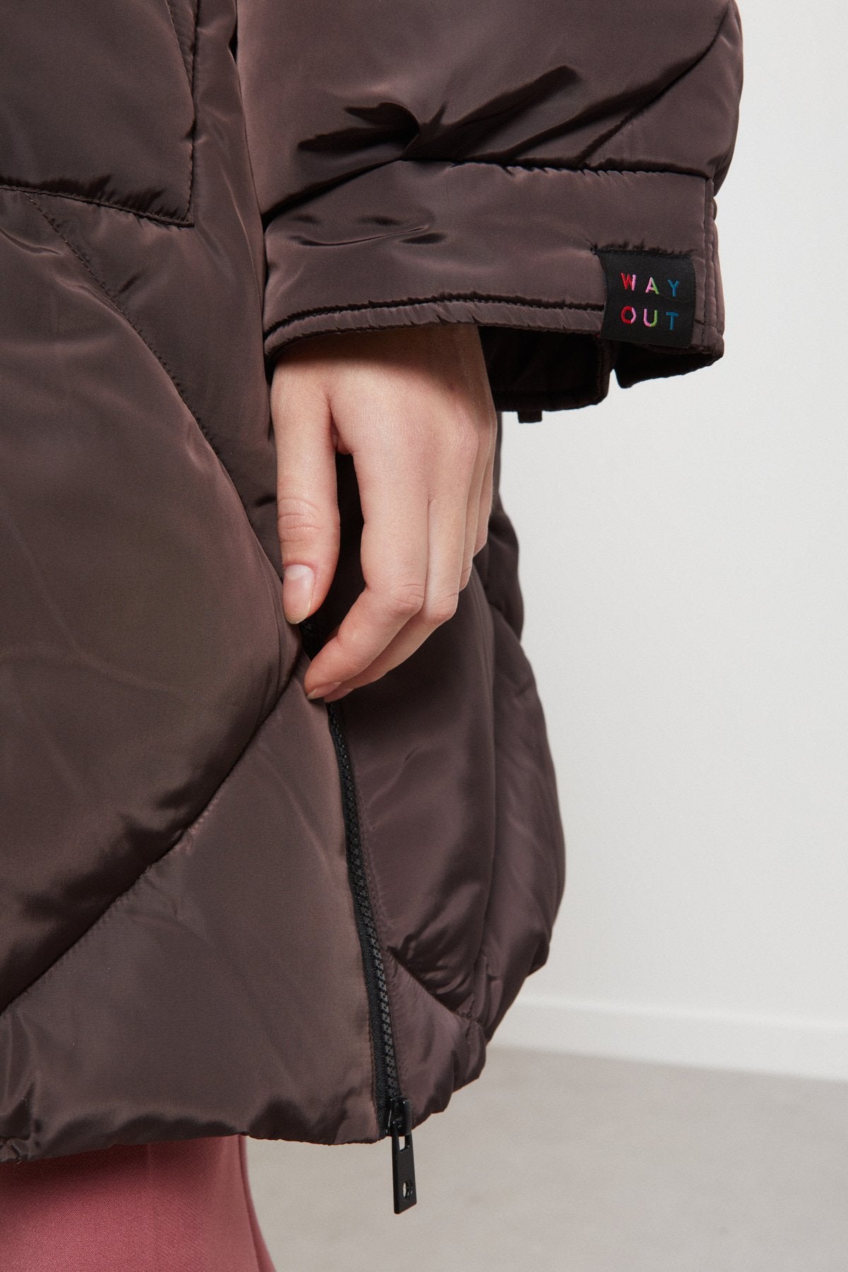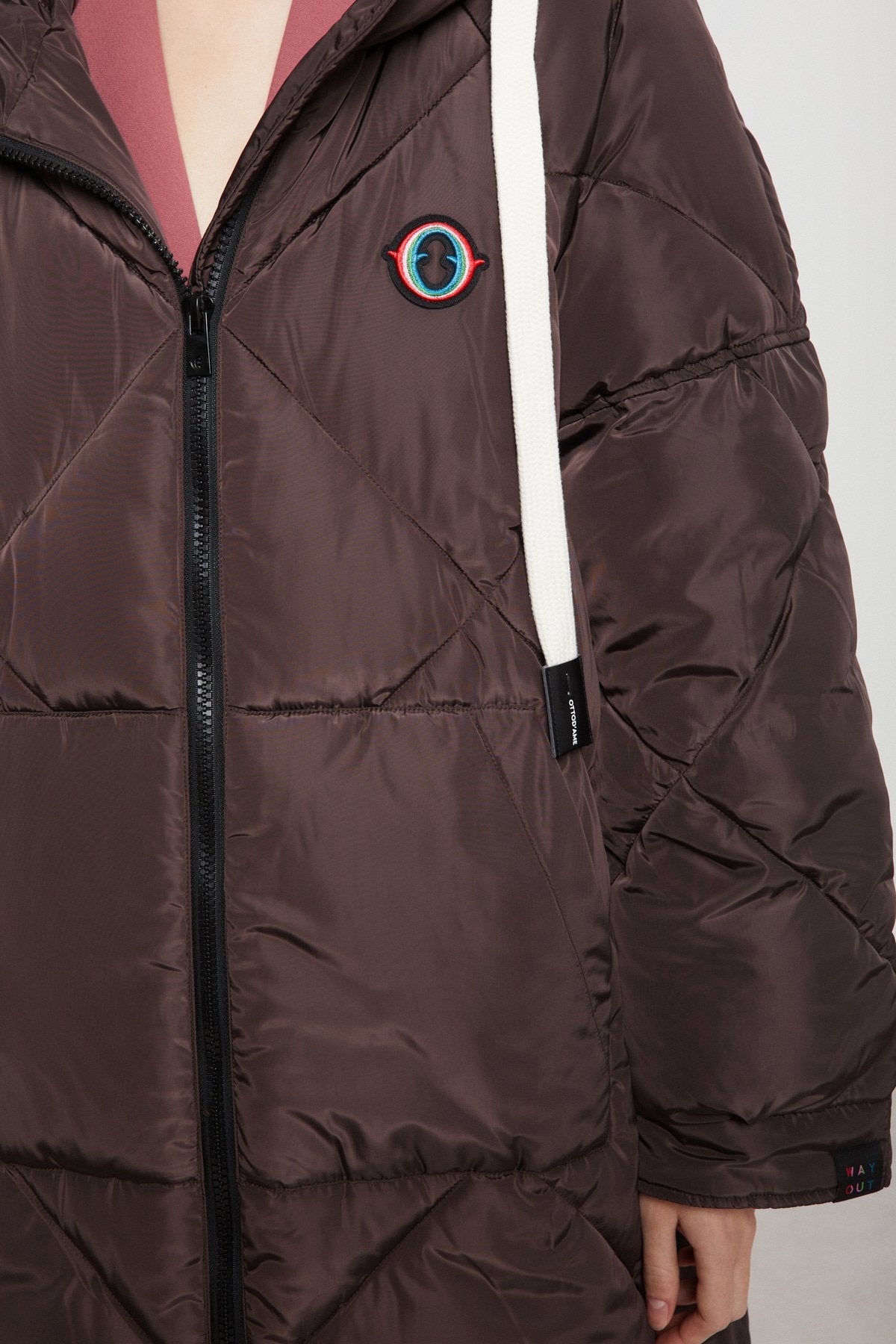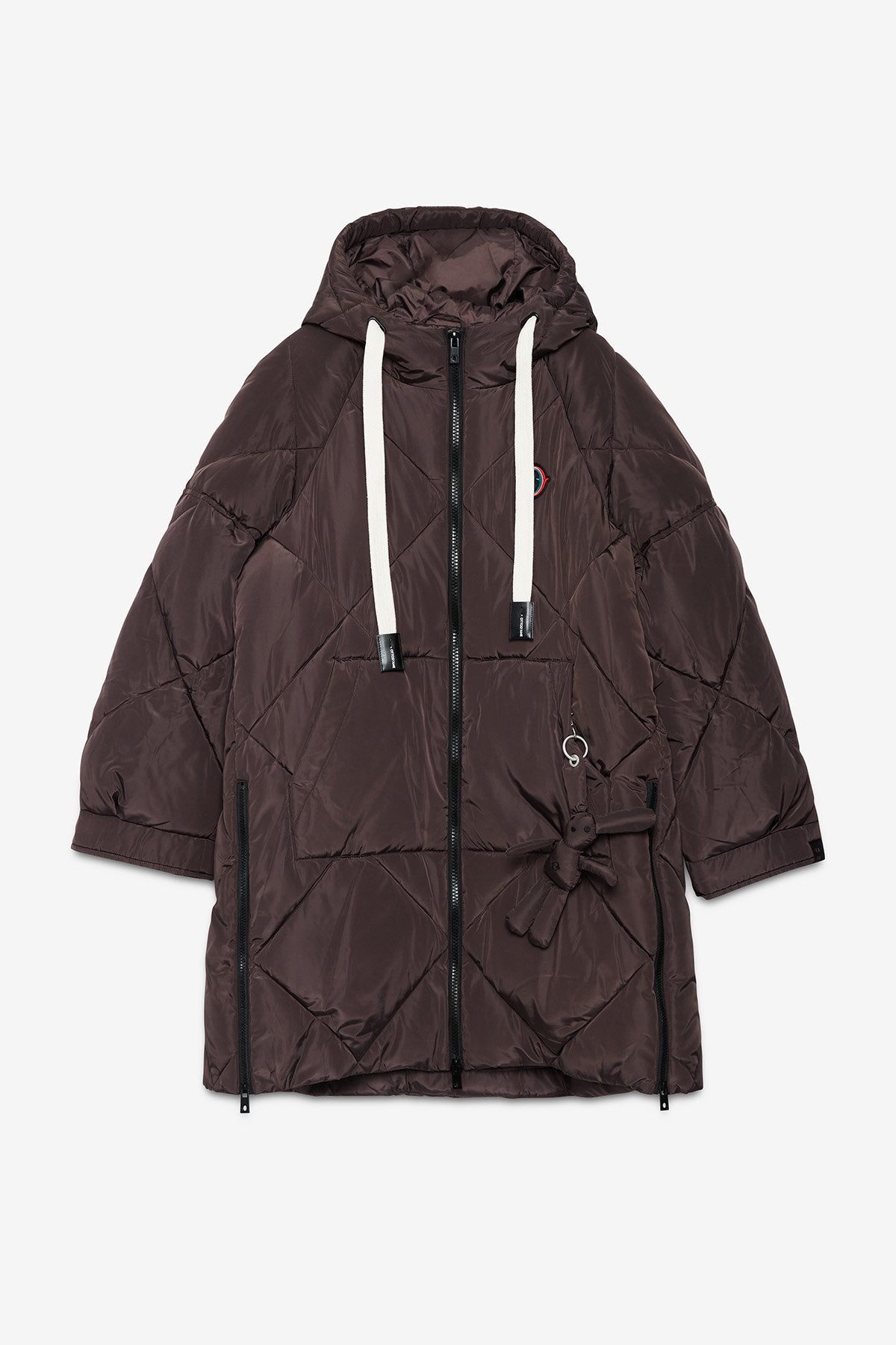 Piumino midi imbottito con impunture, zip e cappuccio con coulisse a contrasto.