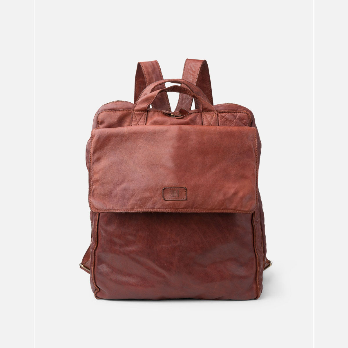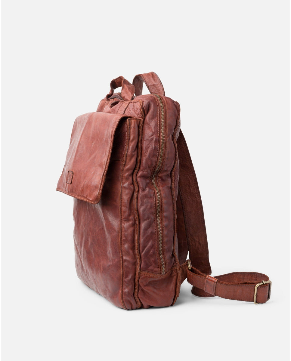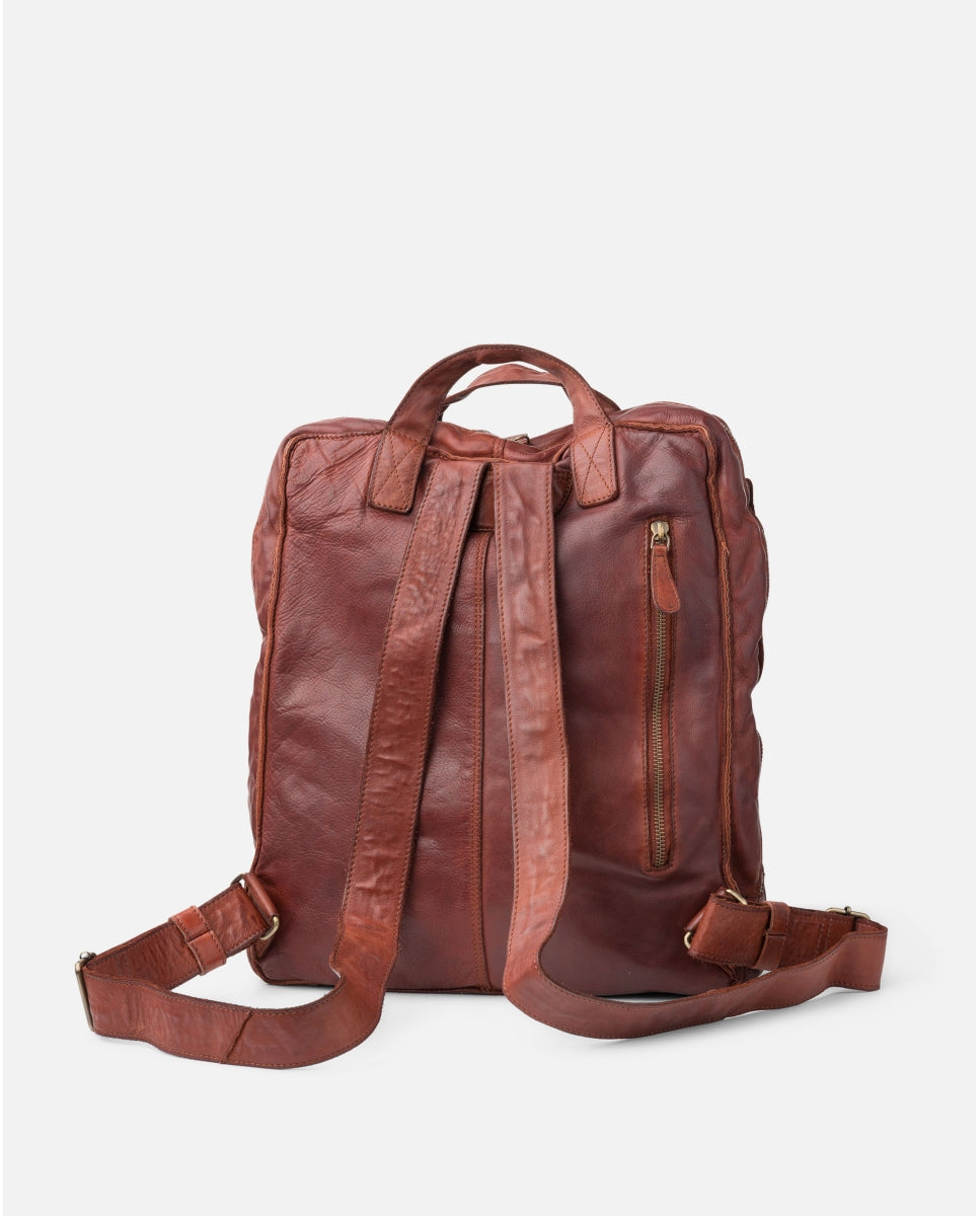 Zaino grande in pelle bovina lavata. Patta con bottone a pressione in metallo. Ampia apertura centrale e chiusura con cerniera. Molteplici tasche esterne e interne. Spallacci regolabili. Fodera in cotone.